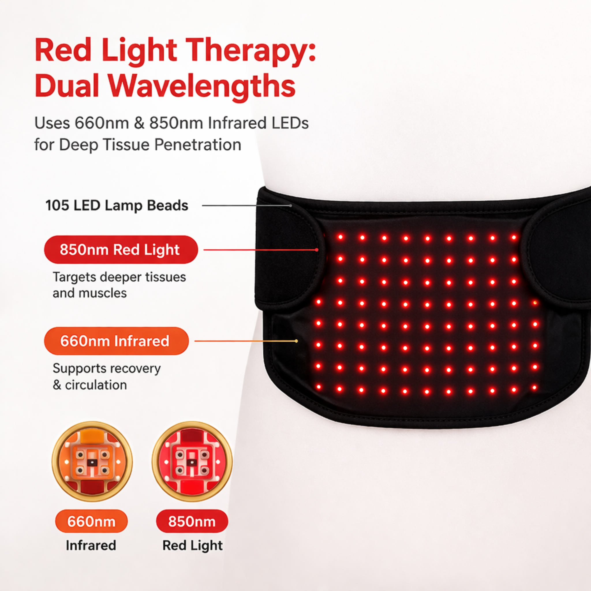 660nm red and 850nm near-infrared LEDs deliver light energy into your tissue. These are the same wavelengths widely used in published photobiomodulation research. Red and near-infrared light may help support your body's natural recovery processes.
